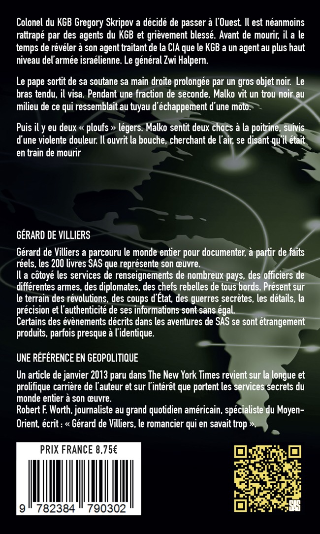 Colonel du KGB Gregory Skripov a décidé de passer à l'Ouest. Il est néanmoins rattrapé par des agents du KGB et grièvement blessé. Avant de mourir, il a le temps de révéler à son agent traitant de la CIA que le KGB a un agent au plus haut niveau de l'armée israélienne. Le général Zwi Halpern. Le pape sortit de sa soutane sa main droite prolongée par un gros objet noir. Le bras tendu, il visa. Pendant une fraction de seconde, Malko vit un trou noir au milieu de ce qui ressemblait au tuyau d’échappement d’une moto. Puis il y eu deux « ploufs » légers. Malko sentit deux chocs à la poitrine, suivis d’une violente douleur. Il ouvrit la bouche, cherchant de l’air, se disant qu’il était en train de mourir.
