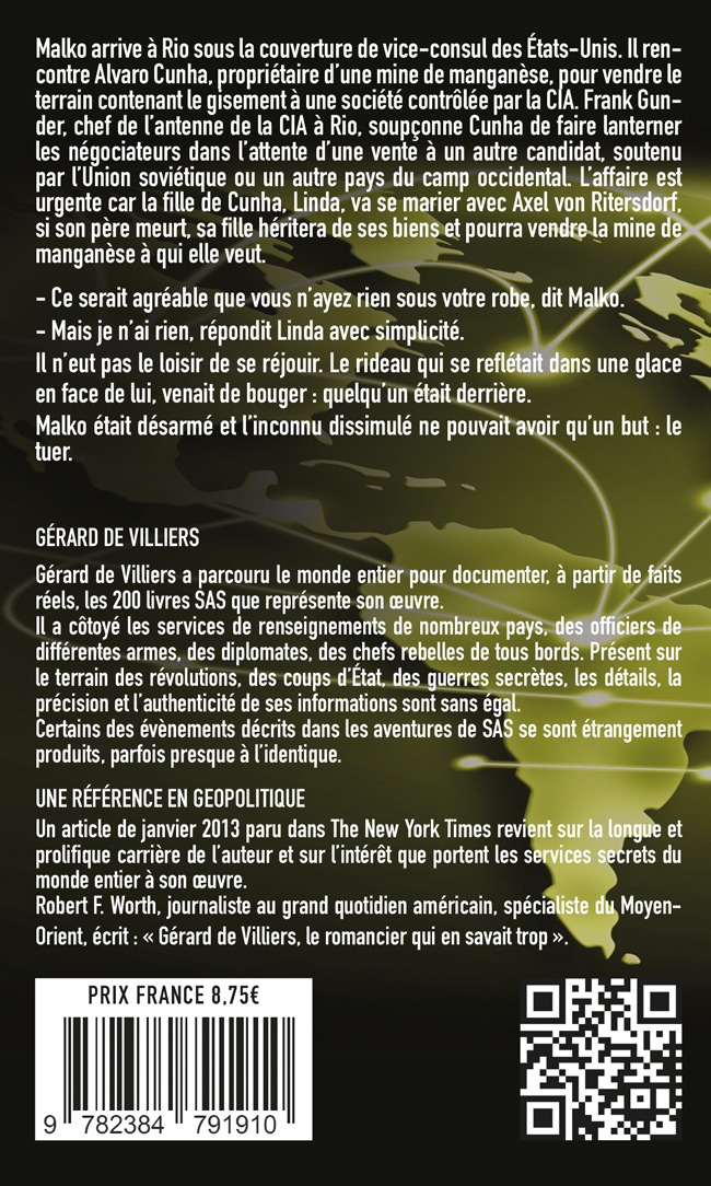 Malko arrive à Rio sous la couverture de vice-consul des États-Unis. Il rencontre Alvaro Cunha, propriétaire d'une mine de manganèse, pour vendre le terrain contenant le gisement à une société contrôlée par la CIA. Frank Gunder, chef de l’antenne de la CIA à Rio, soupçonne Cunha de faire lanterner les négociateurs dans l'attente d'une vente à un autre candidat, soutenu par l'Union soviétique ou un autre pays du camp occidental. L'affaire est urgente car la fille de Cunha, Linda, va se marier avec Axel von Ritersdorf, si son père meurt, sa fille héritera de ses biens et pourra vendre la mine de manganèse à qui elle veut. - Ce serait agréable que vous n’ayez rien sous votre robe, dit Malko. - Mais je n’ai rien, répondit Linda avec simplicité. Il n’eut pas le loisir de se réjouir. Le rideau qui se reflétait dans une glace en face de lui, venait de bouger : quelqu’un était derrière. Malko était désarmé et l’inconnu dissimulé ne pouvait avoir qu’un but : le tuer.