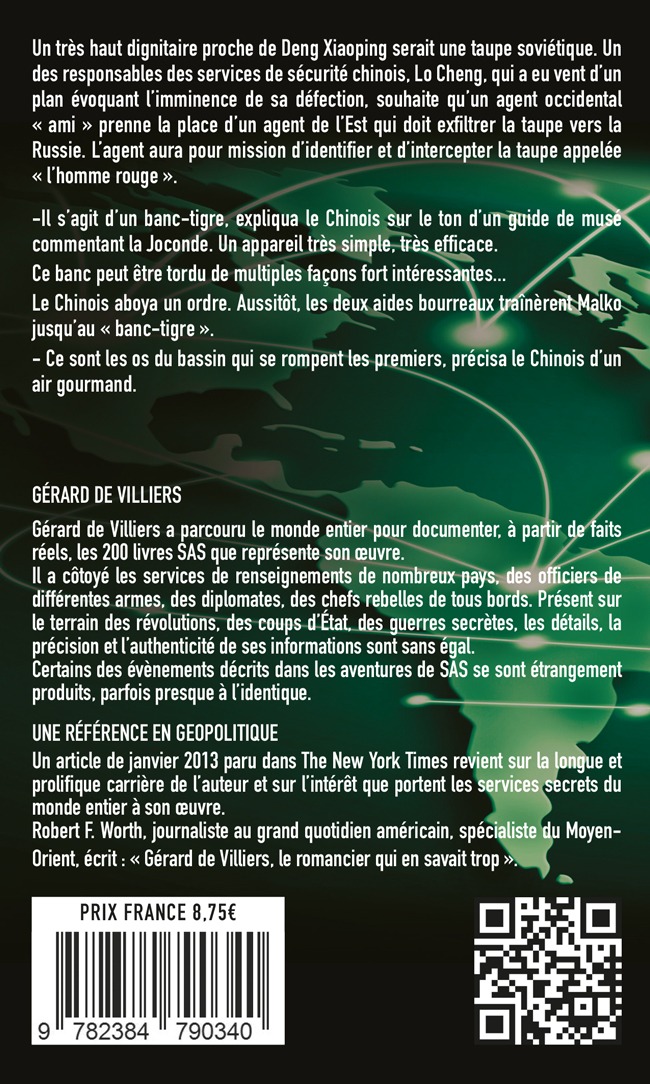 Un très haut dignitaire proche de Deng Xiaoping serait une taupe soviétique. Un des responsables des services de sécurité chinois, Lo Cheng, qui a eu vent d'un plan évoquant l'imminence de sa défection, souhaite qu'un agent occidental « ami » prenne la place d'un agent de l'Est qui doit exfiltrer la taupe vers la Russie. L'agent aura pour mission d'identifier et d'intercepter la taupe appelée « l'homme rouge ». -Il s’agit d’un banc-tigre, expliqua le Chinois sur le ton d’un guide de musé commentant la Joconde. Un appareil très simple, très efficace. Ce banc peut être tordu de multiples façons fort intéressantes... Le Chinois aboya un ordre. Aussitôt, les deux aides bourreaux traînèrent Malko jusqu’au « banc-tigre ». - Ce sont les os du bassin qui se rompent les premiers, précisa le Chinois d’un air gourmand.